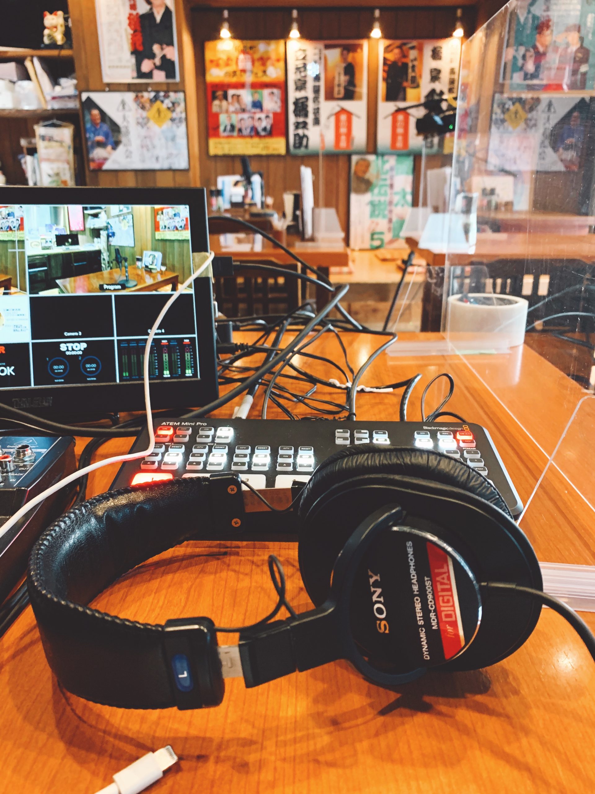 弊社内スタジオより。2020年の5月には連続10日、様々な噺家や色物の師匠方をお呼びし、配信で寄席を再現するような試みを初めて行いました。 落語はお客様の目線でカメラ1台の固定ですが、紙切りや太神楽などの芸を上から狙うカメラワークなどで工夫し、好評をいただきました。